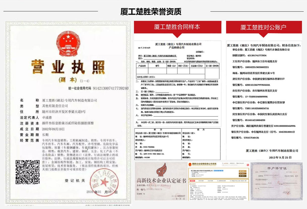 楚胜汽车集团有限公司销售分公司以全新的面貌对外运营。公司主要生产、销售各类专用汽车、工程机械和金属结构件。企业的注册商标"楚胜牌"为"湖北省著名商标"。产品被评为 "中国消费者满意品牌"、"全国质量过硬服务满意放心品牌"、"湖北名牌产品";企业被评为"守合同重信用"企业、银行"AAA"信用企业、高新技术企业;通过了ISO9001质量认证、CCC认证,并积极推行TS16949、IS014000等认证体系。购车热线:13617227908